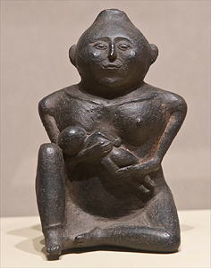 Above left: Monks Mound, the largest mound at Cahokia. Above right: Nursing Mother Effigy found at Cahokia Mississippian Culture, built and inhabited from 700 C.E. to 1400 C.E., located near Collinsville,Illinois, or about 16 miles northeast of St. Louis, Missouri. These mounds are the largest north of Central America. Elevation is c.128 meters (419 feet) above sea level. Materials: earth. Data for CG model: