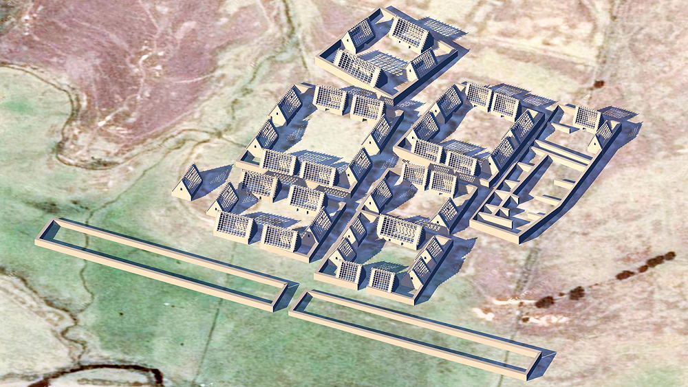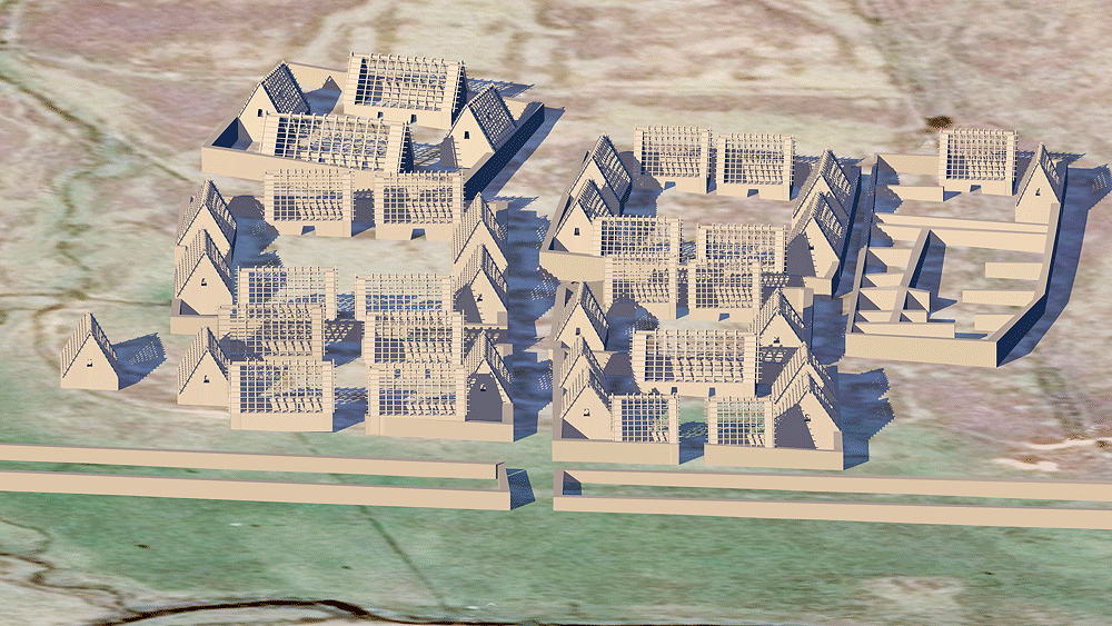 Photomontage of Caxas Inca house courtyards on aerial photo of actual site. Data for CG model: |