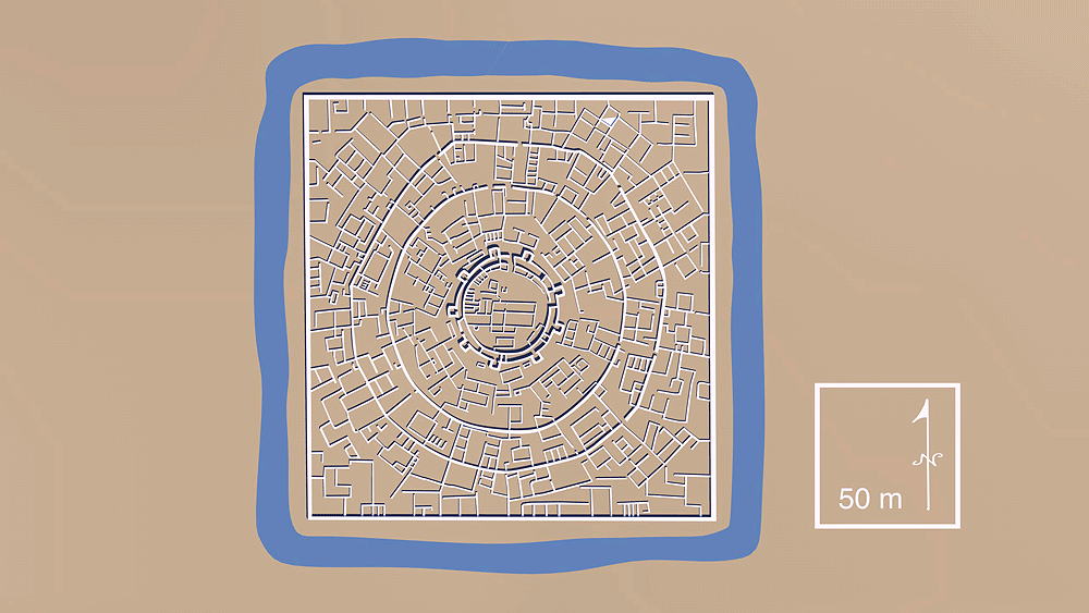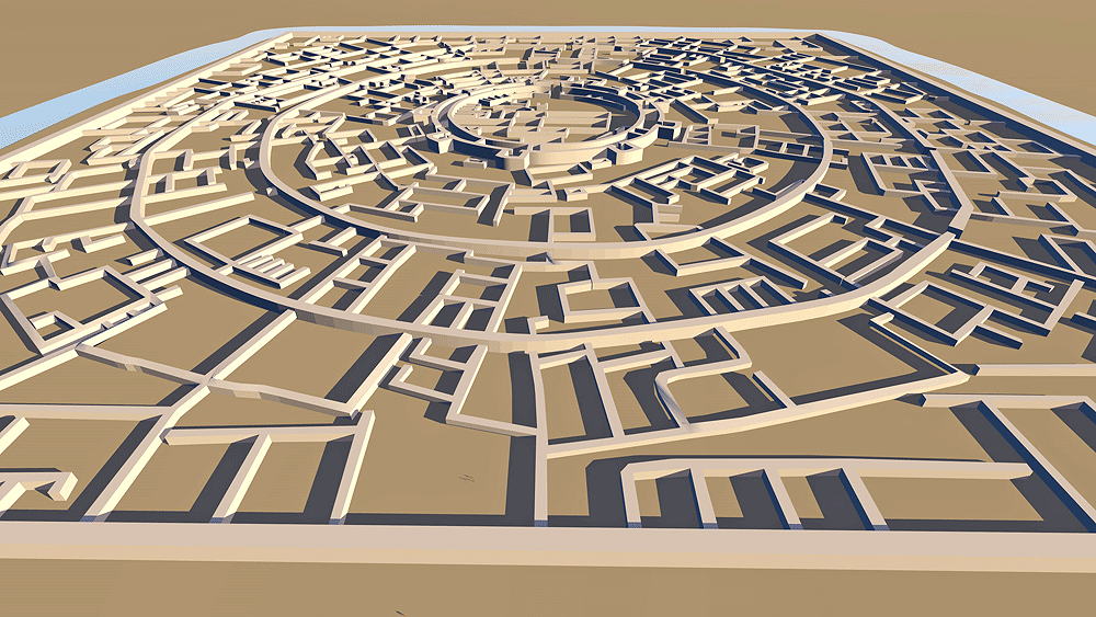 Dashly Ancient Bactria Civilization, occupation is dated to the late Bronze Age, (2300-1700 BCE) and the Iron Age (1700-800 B.C.E.) in Bactria (present-day Afghanistan). Possible uses include temple and fortified citadel palace; located south of the Amu Darya River in Northern Afghanistan's Jozjan Province ca 35 km northeast of Āqča, Afghanistan. typical of "tripura" three concentric wall layouts used in Bactria. Elevation is c. 172 meters (564 feet) above sea level. Materials: Mud brick walls and wood roof structure; mud roof. Data for this CG model from |