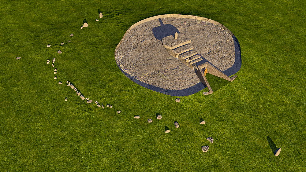 A passage mound of Neolithic culture, radio-carbon dated c. 5200 BCE. - 4360 BCE and in use for three thousand years. It is one of the earliest dated Megalithic sites in Europe. Located in the Carnac woods of Brittany, France. The entrance to the under mound chamber orients 33 degrees south of east, close to the midwinter sunrise. It was excavated in 1863 and again in 1925; the main passage is 6.5 metres long leading to a large chamber where artifacts were found from a succession of occupants, which included axes, pearls, arrow heads, and 147 variscite beads, which were found lying next to ceramics dating from the late Neolithic and the Bell Beaker period. Elevation is c.18 meters (58 feet) above sea level. Materials: Monolithic stone walls and capstones, with earth covering. Data for CG model: |