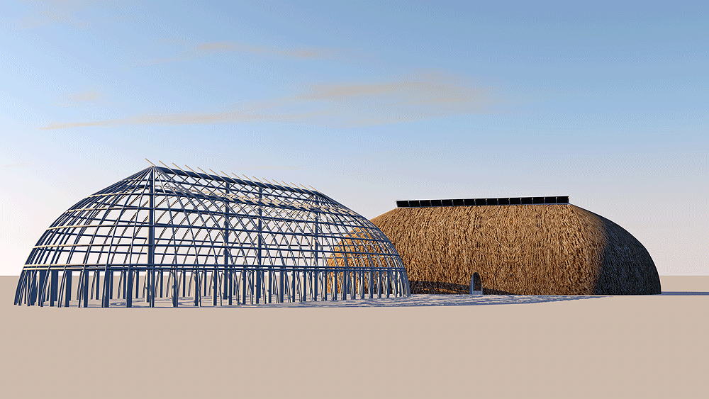 Kuikuro, Kamayura, Teupasentimp, and Yawalapiti Cultures, traditional village multi-family house, still in use, located in Xingu Region of Brazil. Elevation varies c.275 meters (900 feet) abobe sea level. Materials: wood columns, wall frames; wood wood beams, rafters, and purlins for roof structure; thatch roof. Data for CG model: |