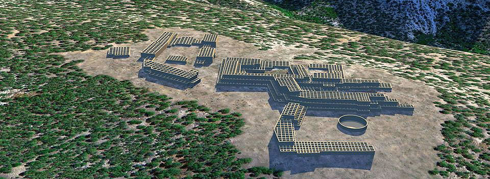 Photomontage of Kwastiyukwa Pueblo upon aerial photo of actual site in the volcanic Jemez Mountains of New Mexico. This is viewing toward the south, with the Sandia Peaks on the horizon to the upper left. Data for CG model: |