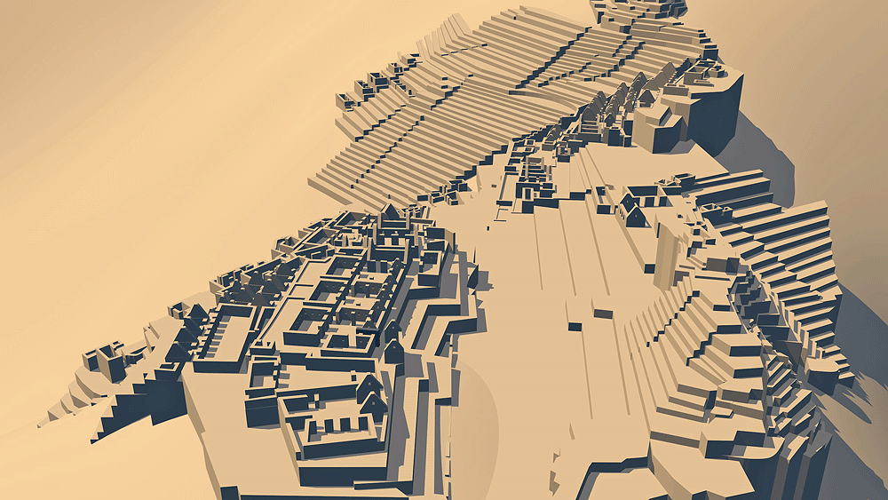 Inca Civilization, 15th century C.E.; located in the Cusco Region, Urubamba Province, Machupicchu District of Peru. Elevation varies c. 2440 meters (8000 feet) above sea level. Materials: megalithic stones, stone walls, wood roof beams and purlins, thatch roof. Data for CG model: |
