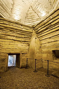Neolithic Scottish culture, chambered cairn and passage tomb, located on Mainland Orkney, Scotland near Skara Brae; it was built c. 3000 BCE to 2800 BCE, using carefully crafted stone slabs weighing as much as 30 tons. The entrance passage which is 3 feet high and 36 feet long leads to the central nearly square chamber measuring 15 feet each side, and covered by a beehive shaped vault (which had partially collapsed). The culmination and height of the original roof vault is therefore unknown. The corners of the central room are 'buttresses" composed of large standing stones and flat stacked stones. Maeshowe is part of a designated World Heritage site. Elevation is c.11 meters (36 feet) above sea level. Materials: Monolithic stone walls and capstones, with stone and earth covering. Data for CG model: |