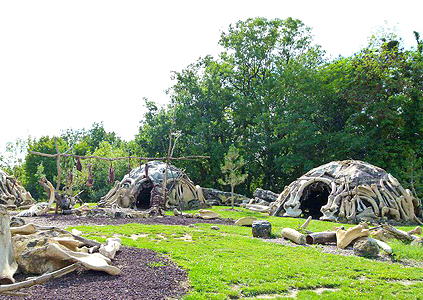 Cro-Magnon Culture, near Kiev, Ukraine, dated to Neolithic times, c. 13,000 B.C.E., constructed with mammoth tusks, skulls, and bones, which Cro-Magnon people mined from mammoth trap trenches constructed by Neanderthal people, 100,000 years earlier (!). Located in Ukraine, in the Kaniv Raion (district) of the Cherkasy Oblast province. Inhabitants lived near the southern seas during summer and migrated to these very cold sites during winter, where they remained inside most of the time, storing food brougnt the migration in cystes just outside the door; no evidence of winter hunting. The walls were made of stacked leg bones and mandibles.. The roof was made of tusks likely covered by insulating hides. More than a hundred mammoths mandibles used, were mined from a nearby 100,000 year old mammoth "graveyard" (of the earlier Neandertal humans). Pits were dug into the permafrost nearby may have been used to store frozen meat for a year-round meat supply. The site may be an early "village". in 2014, at the Kostenki 11 site, near Voronezh, Ukraine, adjacent to the Don River, archaeologists discovered a circular bone structure, 12.5 m (41 ft) in diameter, dating from 20,500 BCE, the coldest period of the last Ice Age. There was no obvious entrance to the circle, in which was found 51 lower jaws and 64 individual mammoth skulls, plus reindeer, horse, bear, wolf, red fox and arctic fox bones, that formed a wall perhaps 2 ft in height. The diameter of the structure was so large that it may not have been used as a dwelling; there is no evidence of a roof structure; the region had few trees for roof structure. Scientists theorize the structure may have been used for religiious ceremonies. Elevation is c. 84 meters (276 feet) above sea level. Materials: mammoth tusks, skulls, and other long bones; covered in skins and insulated with furs and pelts. Data for CG model: