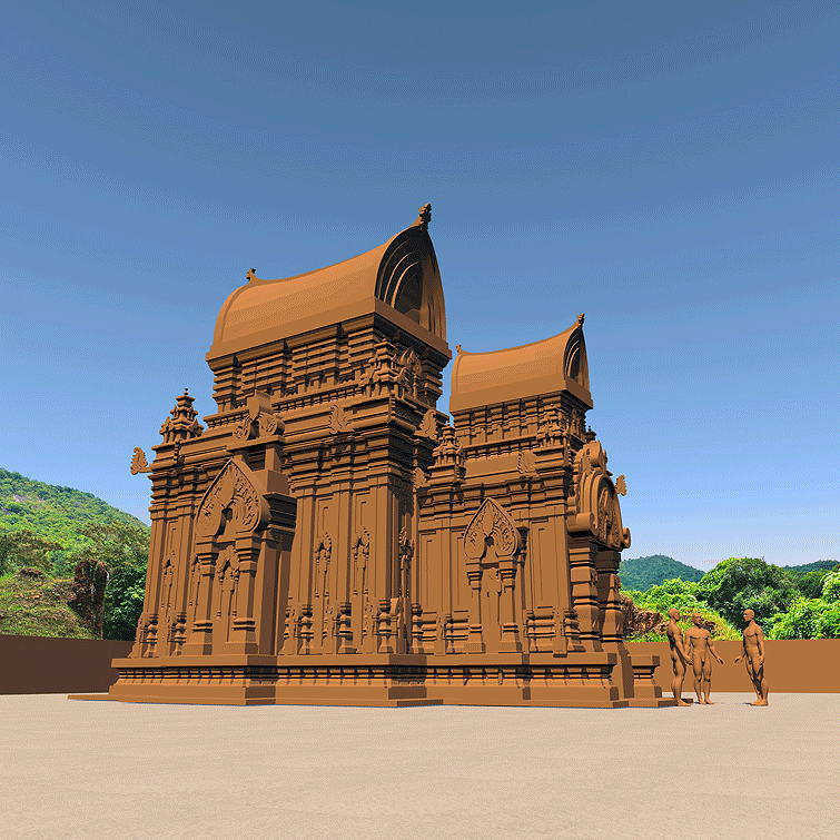 Champa Culture, South Vietnam; Hindu Temple Sanctuary located 69 km southwest of Danang, near the village of Duy Phú , in Quang Nam Province, My Son is the former capital of the Champa Kingdom, from c. 4th century C.E. to the 15th century C.E and the focus of the Royals' Hinduism. The French archaeologist, Henri Parmentier, did extensive surveys of the central Shiva (Bhadresvara) Temples at the end of 19th century C.E. during the French Occupation of Vietnam, at which time ruins of 70 temples existed; of these, only 25 ruins remain today, after extensive U.S. bombing during the American War. Note the "saddle" roof, a connection to the ancient Yoyoi Period of Japan. The structures are made from fired and finely tooled clay bricks, the paper-thin mortar composition for which remains a secret. The site was recognized as a World Heritage site in 1999. Elevation is c. 45 meters (149 feet) above sea level. Materials: Fired brick with integrated stone architectural details. There is controversy as to whether the bricks were fire before or after placement. Also, the mortarless bricks are glued together with a still mysterious substance. Data for CG model: |