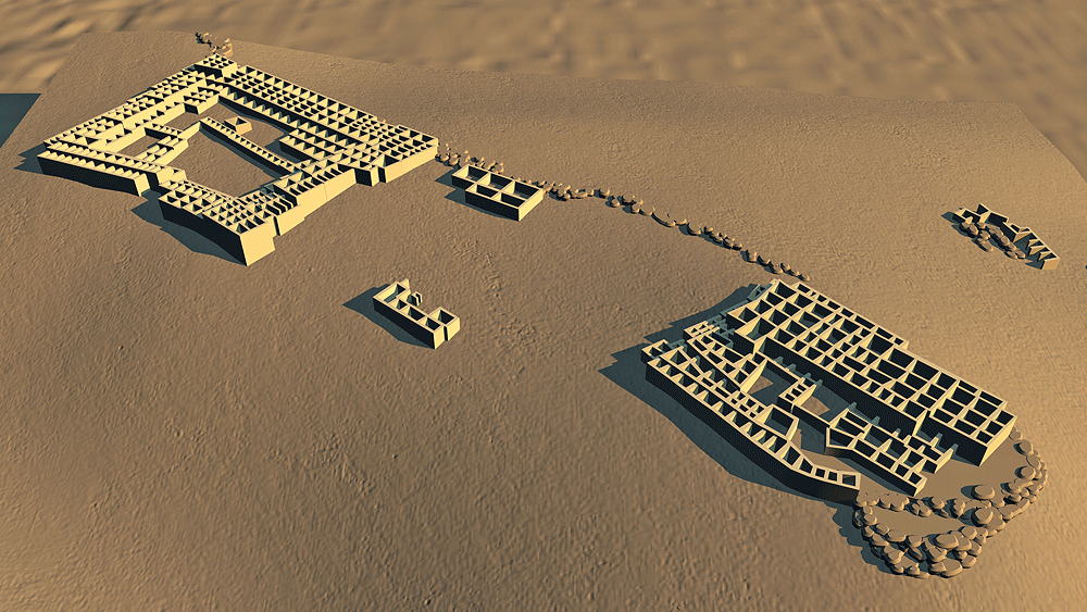 Nuvakwewtaqa (Hopi for "Snow Belt", formerlay known as "Chavez Pass") Sinaqua Culture, constructed and occupied between 1050 C.E. and 1425 C.E..; located on the Coconino National Forest in Chavez Pass, Arizona, about 15 miles southwest of the Meteor Crater, in a natural gap through a rocky escarpment separating the arid, lower altitude Little Colorado River Basin from the cooler, moister Anderson Mesa and Mogollon Rim areas. The Chavez Pass area is known to the Hopi as Nuvawewtaqa, or "Snow Belt". The Zuni refer to the area as Kumanch an A'l Akkwe'a and the Navajo call it Jettipehika. These cultures all have stories transmitted through generations about the landscape and earlier residents. The only perennial waterway in the area is the Little Colorado River about 30 miles to the northeast. The original inhabitants of Nuvawewtaqa relied upon a spring in Chavez Pass for drinking water. Master farmers used a dry-adapted variety of corn and other plants utilizing their extensive knowledge of the land and what would flourish in that environment, utilizing techniques of rain water runoff capture management. Elevation is 2120 meters (6600 feet) above sea level. Materials: main floor walls: basalt stone; upper walls: tabular sandstone or limestone, mortar used on tallest walls, up to three stories; wood log roof structure, with mud/clay roof. Data for CG model: |