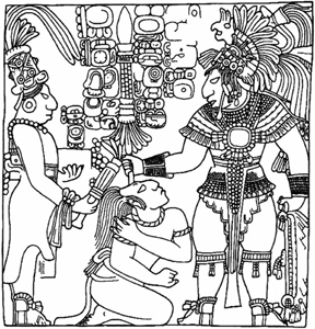 Above left: Perspective drawing of The Acropolis of Piedras Negras by Tatiana Proskouriakoff, 1909; Above middle: Drawing from stone depiction of the unfortunate end of the Piedras Negras Royal, T'ul Chik, under the hands of his warring ememies from La Pasadita; Above right: Perspective drawing of the Sweat Bath at Piedras Negras, by Tatiana Proskouriakoff, 1909. Maya Civilization from Late Pre-Classic to Classic Period, 200 B.C.E.- 800 C.E.; located on the Usumacita River in Petén department of Guatemala. This city was a major trading route, and as such, it superb scuptures and stelae represent influence from many other Mayan places. Location coordinates: 17°10'12.6"N 91°15'51.0"W Elevation ils c. 114 meters (375 feet) above sea level. Materials: stone.
