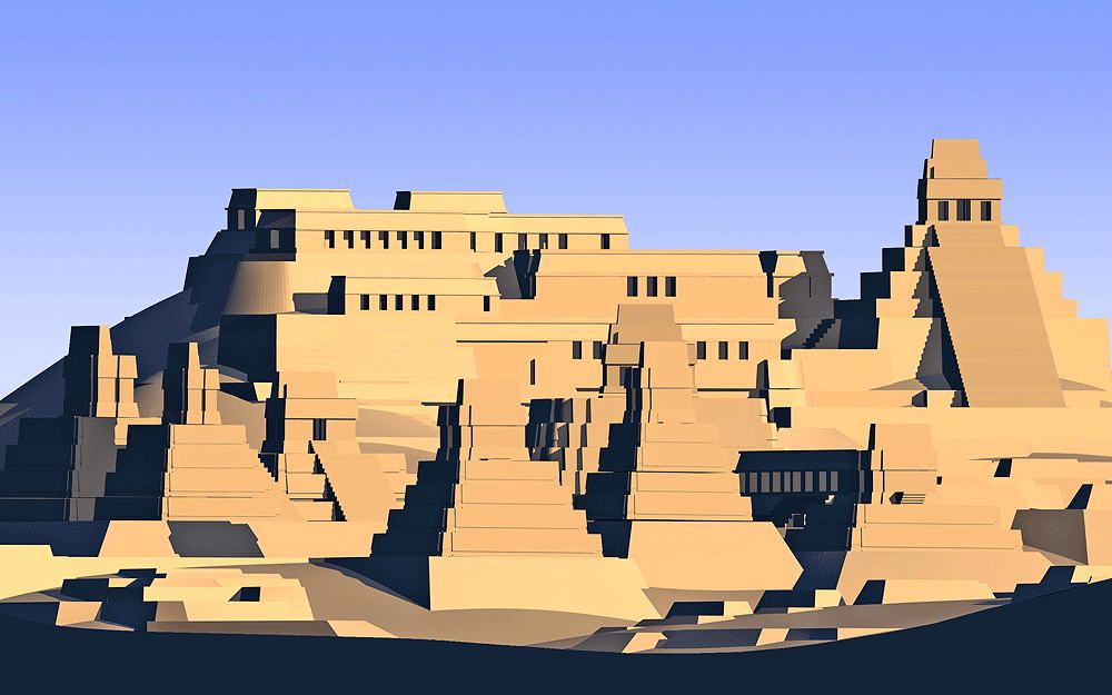Photomontage of Piedras Negras upon photo of actual site on the Usumacita River, looking north. Data for CG mode |