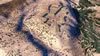 Photomontage of Posi-Ouinge CG model onto aerial photo of the actual site on the north terrace of the Ojo Caliente River valley. New Mexico's highest peak, Mt. Wheeler, above Taos, is visible on the horizon, upper left of image.