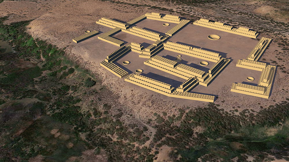 Photomontage of Sapawe'uinge Pueblo CG model upon aerial photo of the actual site, looking southwest toward Abiquiu village and the Jemez Mountains of New Mexico.
