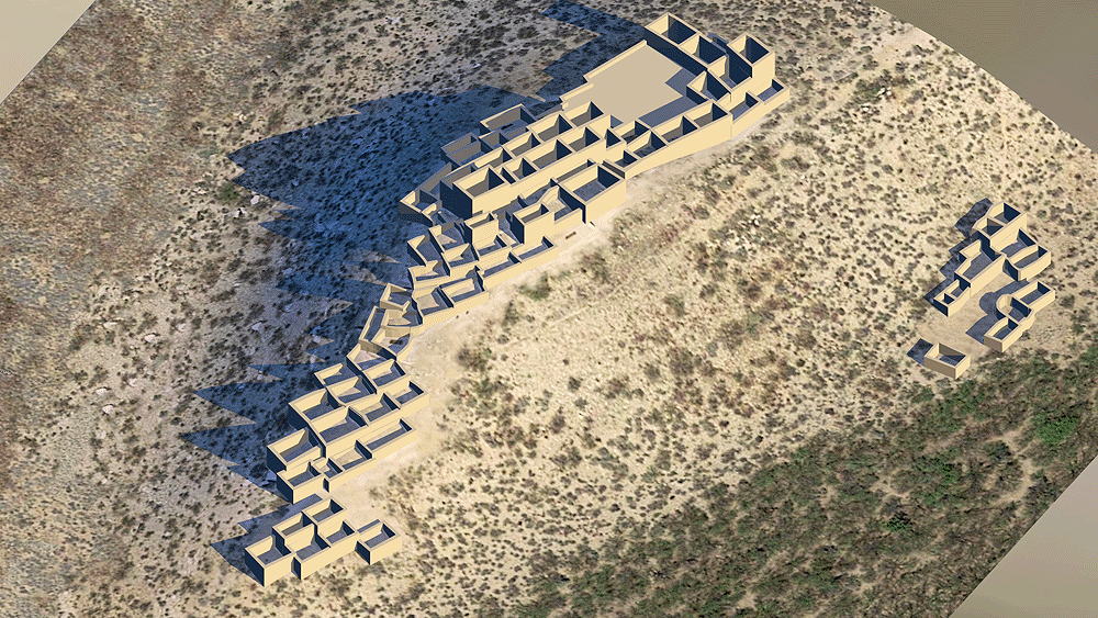Sinaqua Culture, constructed and occupied between 1125 C.E. and 1400s C.E.; located above the Verde River, northeast of Prescott, in Central Arizona. Elevation is 1041 meters (3418 feet) above sea level. Materials: walls: sandstone or limestone, mortar used on tallest walls, up to three stories; wood log roof structure, with mud/clay roof. Data for CG model: |