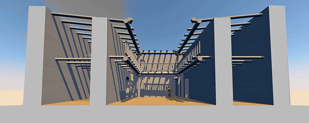 Ur Typical Courtyard House Sumerian and Babylonian Civilization; a Mesopotamian city-state in ancient Mesopotamia, occupation dating from c. 6500 B.C.E.; located at the site of modern Tell el-Muqayyar, Iraq; originally a Persian Gulf coastal city begun c. 3800 B.C.E., near the mouth of the Euphrates and Tigris Rivers before those rivers changed courses. There is a clever design strategy to cool the house naturally by keeping the thermally massive adobe walls in shade, from adjacent houses, second story courtyard balcony and overhanging roof, while, at the same time, introducing soft room lighting from the central courtyard. Elevation is 6 meters (19.69 feet) above sea level. Materials: adobe bricks covered with baked bricks laid in natural occurring bitumen; wood beams and columns. Source of data for this model: |