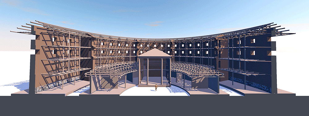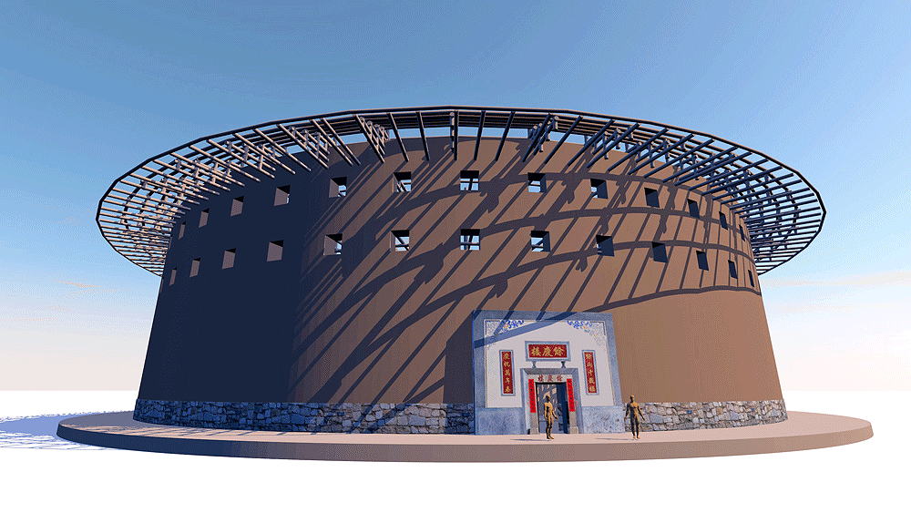 Hakka Culture, Fujian Province, China, housing up to 80 families or more, in use from the 12th Century C.E. to Present, located in Zhenchenglou Hongkeng Yongding in Southeastern Fujian, China. Elevatlon is c. 490 meters (1600 feet) above sea level. Materials: unfired mud brick outer wall and interior fin walls; wood construction for roof, and interior beams, columns, and purlins. Data for CG model: |